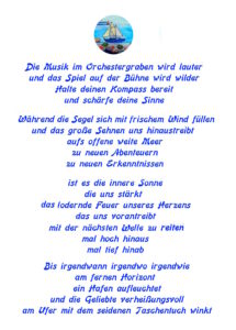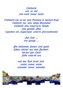 Aktuell: Theateruraufführung 2025: MARE-Harte Tage, gute Jahre, Aktuell: Theater DIE DELIKATEN 2025: BARON MÜNCHHAUSEN. Aktuell: Werbefilm Flying Oma, Aktuell: Bandauftritt Lichtperlen, Aktuell:Kartenset RAUHNACHT POESIE 2024/25, Aktuell: Kartenset KLANG DER POESIE, Aktuell: Bänke der Poesie